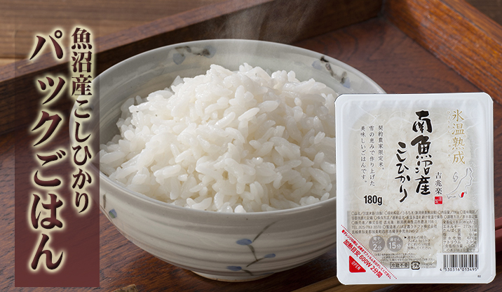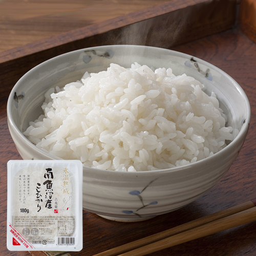 ●氷温熟成させた魚沼産こしひかりをガス直火で炊き上げ、美味しさそのままパックに詰めました。