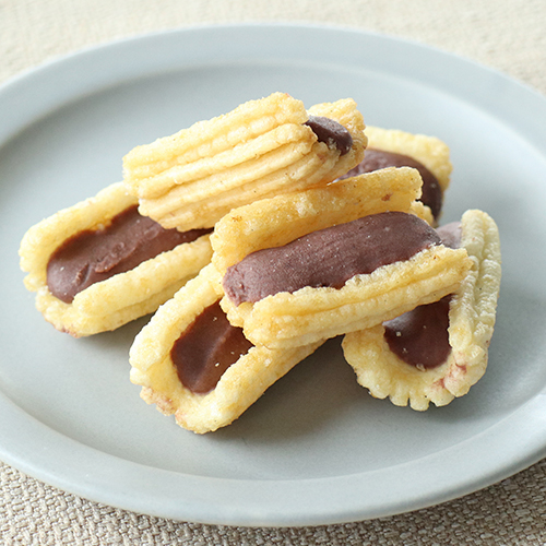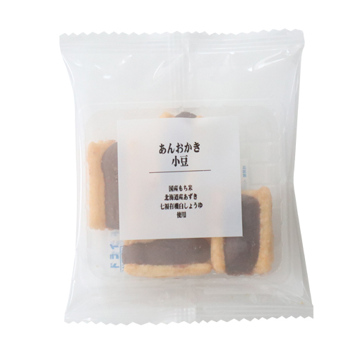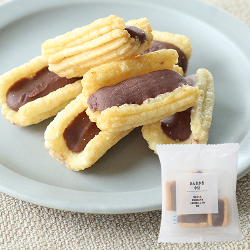 ●揚げた丸い舟形のおかきの真上に、北海道産小豆で作った柔らかあんこがのった、サクサク食感の甘しょっぱい和スイーツ。