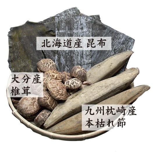 ●本枯れ節の旨みと香りを生かすように、その他の原料は北海道産『昆布』と大分県産『椎茸』のみに厳選しています。