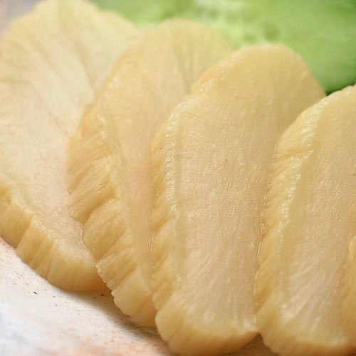 A3:白たくあんの味は大根本来の味です。はざかけによって水分が抜けた大根の中では成分が凝縮されデンプンと糖がうまみと甘みに変化しています。これがこのたくあんの美味しさのヒミツなのです。農家の方の愛情がこもった大根の味を引き出すために調味液に漬け込むのはごく短期間です。白たくあんの名前通り、たくあんの色は薄い黄色ですが、この色は着色料で漬けているのではなく、漬け込んだときに酵母によって大根が自然に黄色く変わっていきます。だから、たくあんによって色が違うのは、手作りのあかしです。たくさんの人の手間と溢れんばかりの愛情によっておいしく作られている寒風さらし白たくあん。自信を持っておすすめオススメいたします。是非、この機会に一度このお味を楽しんで頂けたらと思います。