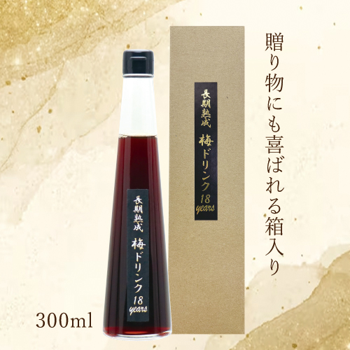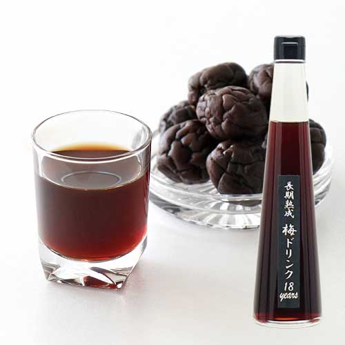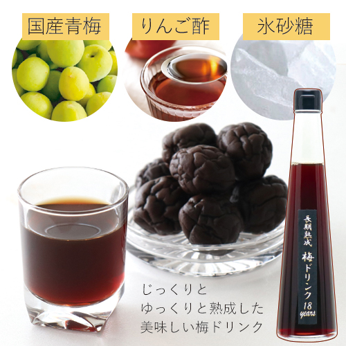 国産青梅を、りんご酢・氷砂糖に漬け、18年以上の長い年月をかけて熟成させた希少な梅ドリンク。